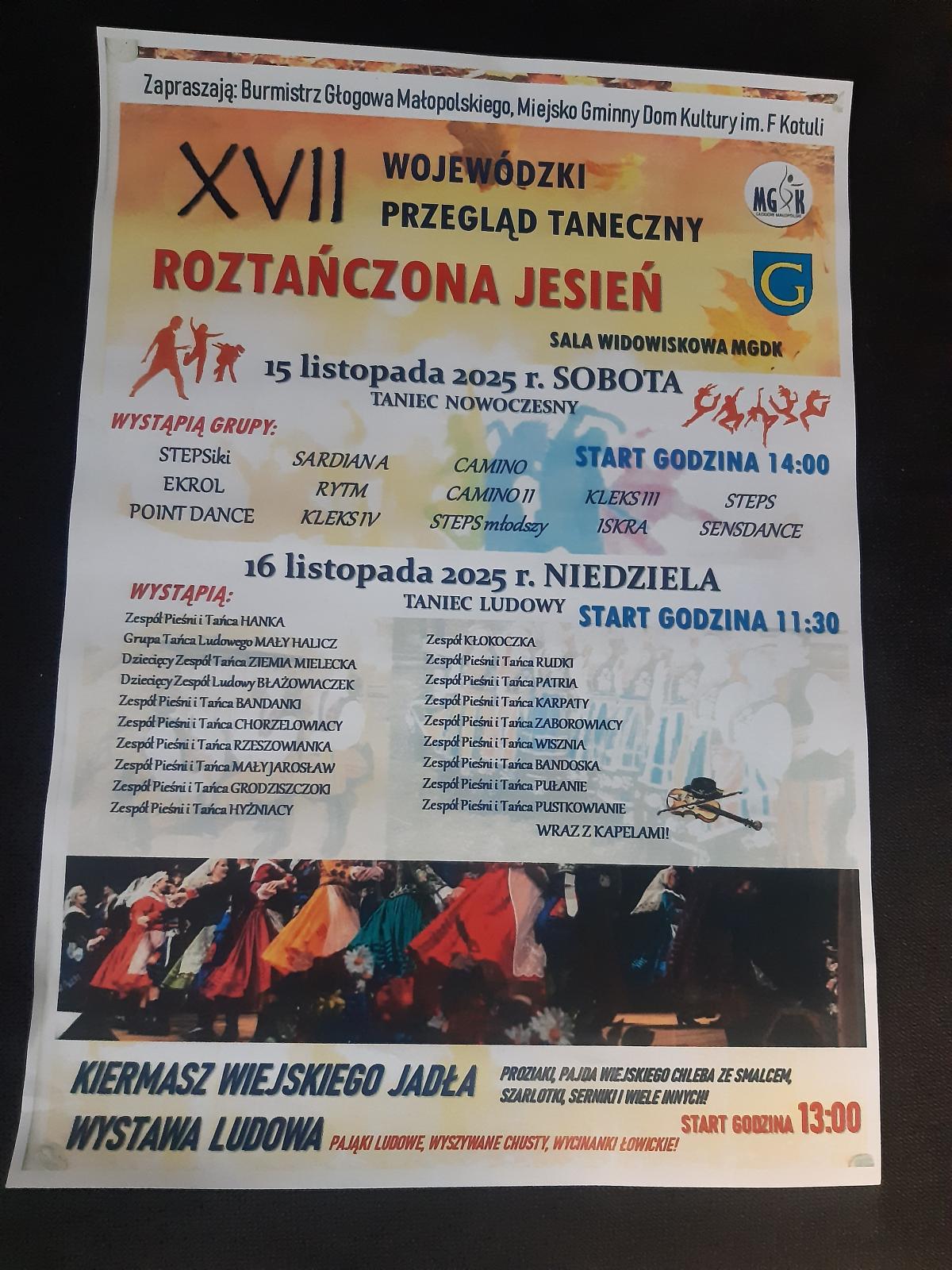 W niedzielę 16 listopada 2025 odbył się 17 Wojewódzki Przegląd Taneczny “Roztańczona jesień” w Głogowie Małopolskim, w którym wziął udział szkolny Zespół Tańca Ludowego „Kłokoczka”.