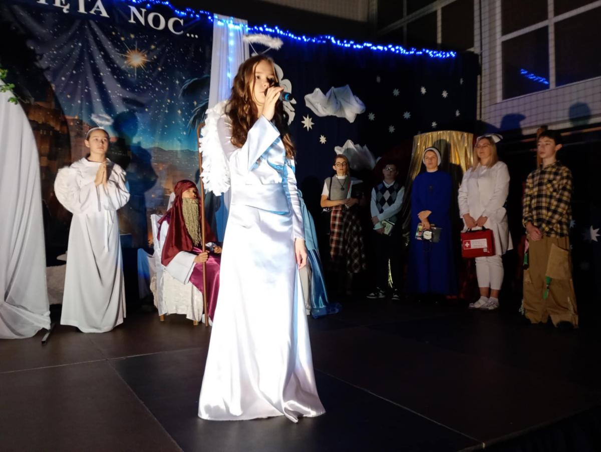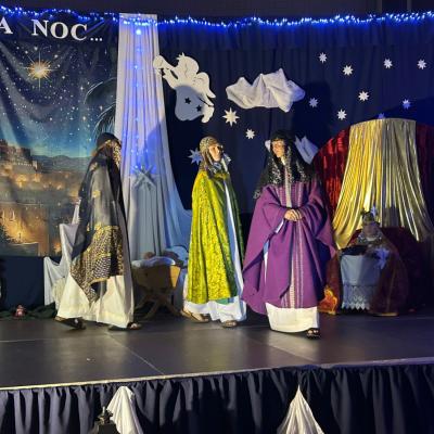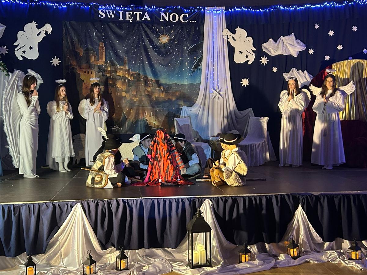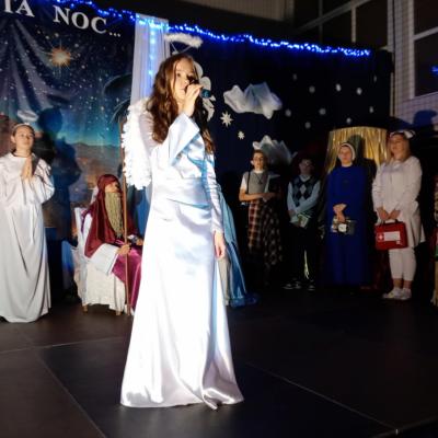 Całość przedstawienia, pokazująca scenki z życia nowonarodzonego Dzieciątka, pasterzy, mędrców, przeplatana była kolędami i pastorałkami. Tańce uwielbienia dla Nowonarodzonego wykonali uczniowie klasy I, II i VI pod opieką p. Bożeny Skubisz i p. Mariusza Prajznera. O dobrą zabawę i miłe doznania słuchowe zadbali zdolni aktorzy z klasy IV, V, VI, VII, VIII oraz szkolny chór pod opieką p. Lesława Pyrcaka.