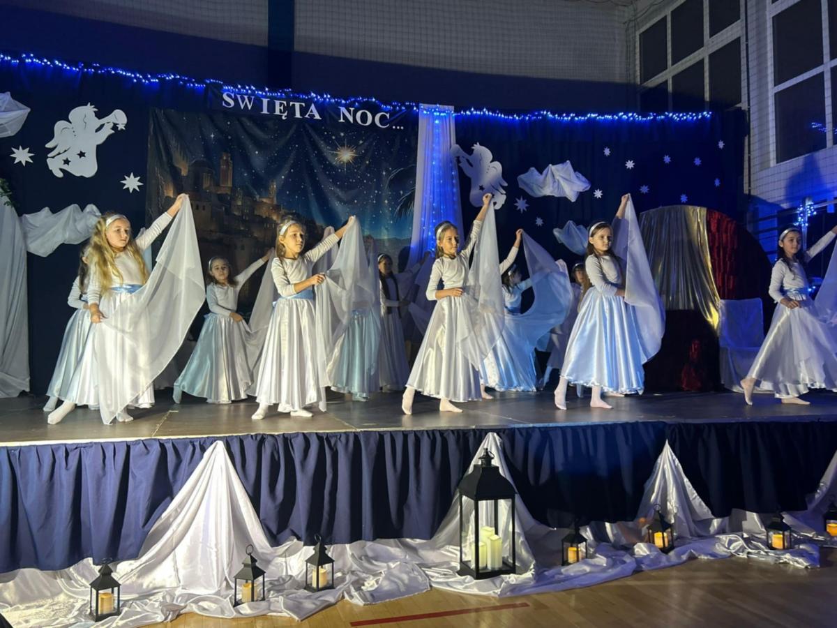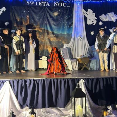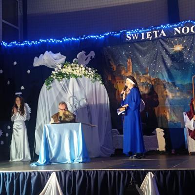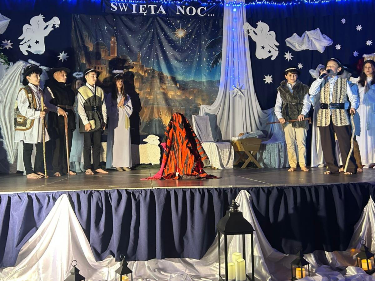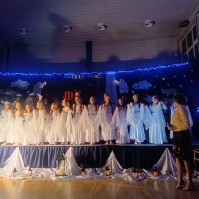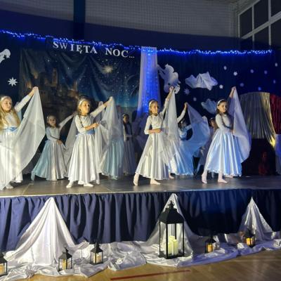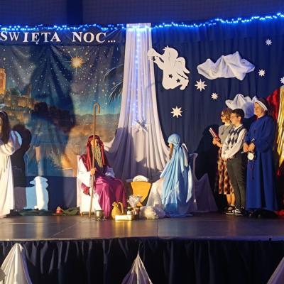 Całość przedstawienia, pokazująca scenki z życia nowonarodzonego Dzieciątka, pasterzy, mędrców, przeplatana była kolędami i pastorałkami. Tańce uwielbienia dla Nowonarodzonego wykonali uczniowie klasy I, II i VI pod opieką p. Bożeny Skubisz i p. Mariusza Prajznera. O dobrą zabawę i miłe doznania słuchowe zadbali zdolni aktorzy z klasy IV, V, VI, VII, VIII oraz szkolny chór pod opieką p. Lesława Pyrcaka.